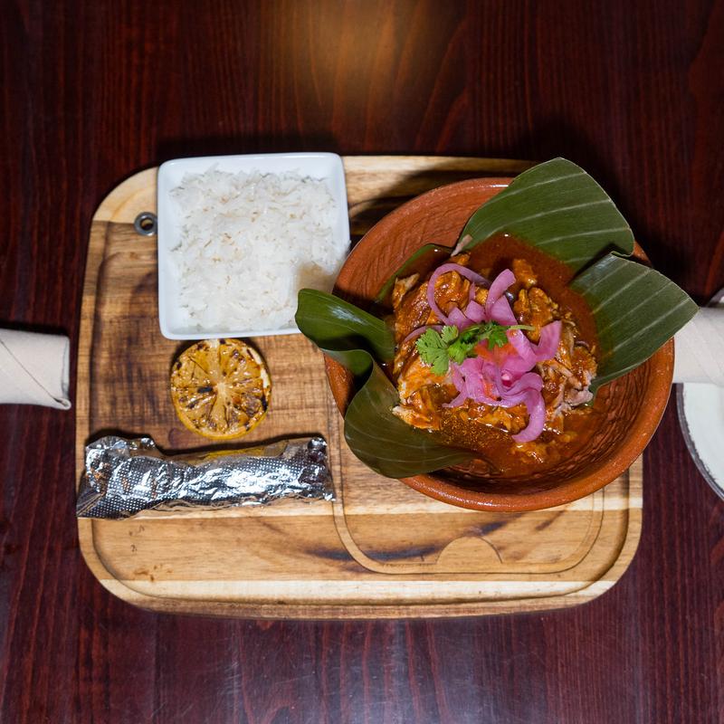 Achiote-citrus pork, rice, beans, tortillas, pickled habanero & onion